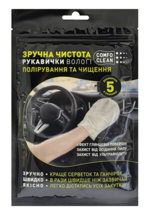 Вологі рукавички «ЗРУЧНА ЧИСТОТА» застосовуються для очищення та полірування панелі приладів (торпедо), дверних карт, догляду за будь-якими поверхнями з пластику, вінілу, гуми, дерева, тощо, в середині та зовні автомобіля за виключенням скла та дзеркал. Рукавички просочені спеціальним розчином, який має унікальні очисні та полірувальні властивості. Відмінно видаляє забруднення як з гладких так і з текстурованих поверхонь, а також полірує та повертає поверхням первинний вигляд та блиск. Відновлює структуру поверхні та освіжує колір. Лишає на поверхні прозорий захисний шар, який має довготривалу захисну дію від ультрафіолету, запобігає розтріскуванню та вигоранню. Надає поверхні антистатичні властивості, які перешкоджають накопиченню пилу та бруду.