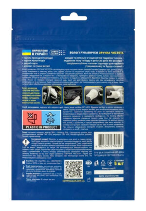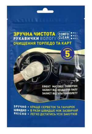 Вологі рукавички «ЗРУЧНА ЧИСТОТА» застосовуються для очищення панелі приладів (торпедо), дверних карт, догляду за будь-якими поверхнями з пластику, вінілу, гуми, дерева, штучної та натуральної шкіри, тощо, в середині та зовні автомобіля за виключенням скла та дзеркал. Рукавички просочені спеціальним розчином, який має унікальні очисні властивості та відмінно видаляє забруднення як з гладких так і з текстурованих поверхонь, гарантуючи ідеальну чистоту. Активні нано-компоненти проникають в пори та мікротріщини поверхонь, витісняючи та видаляючи забруднення. Відновлює структуру поверхні та освіжує колір. Лишає на поверхні прозорий захисний шар, який має довготривалу захисну дію від ультрафіолету, запобігає розтріскуванню та вигоранню. Надає поверхні антистатичні властивості, які перешкоджають накопиченню пилу та бруду. Надає матовий ефект обробленим деталям, перешкоджає появі відблисків.